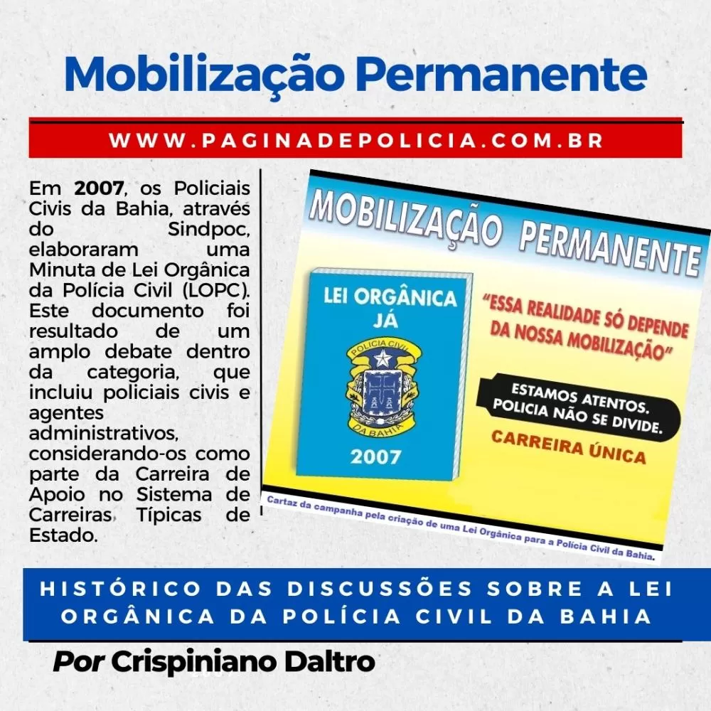 Proposta de Lei Orgânica para a Polícia Civil da Bahia, apresentada no final de 2007 ao governo do Estado, pela direção do Sindicato à época.
