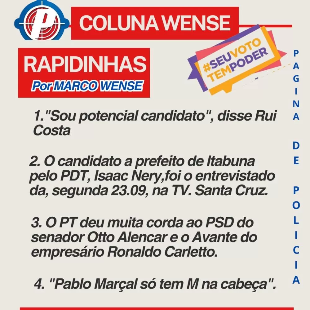 1. Rui Costa “Sou potencial candidato” | 2. O candidato a prefeito de Itabuna pelo PDT, Isaac Nery, foi o entrevistado de 23.09, na TV Santa Cruz | 3. O PT deu muita corda ao PSD do senador Otto Alencar e o Avante do empresário Ronaldo Carletto e 4. “Pablo Marçal só tem M na cabeça”...