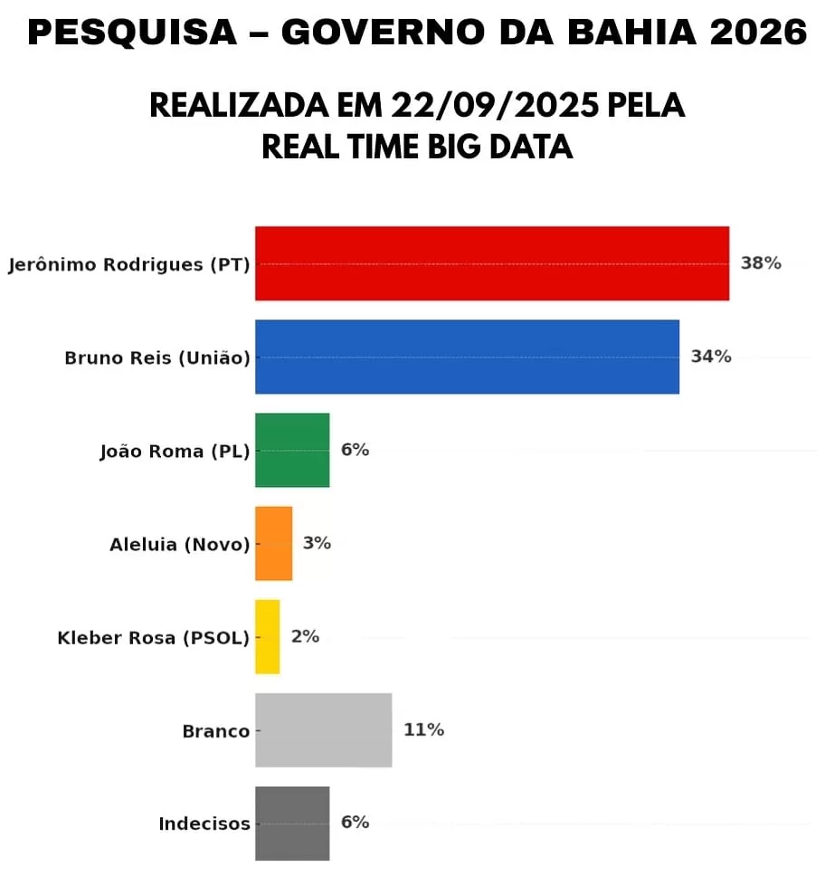 Correligionários de ACM Neto (União Brasil), pré-candidato ao governo da Bahia no pleito de 2026, não ficaram nada satisfeitos com o gráfico abaixo, colocando Bruno Reis, prefeito de Salvador, também do União Brasil, no lugar de ACM Neto.