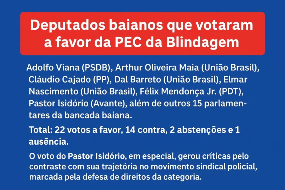 Entre os 39 deputados federais da Bahia, 22 votaram a favor da PEC da Blindagem. Entre eles, nomes como Adolfo Viana (PSDB), Arthur Oliveira Maia (União Brasil), Cláudio Cajado-Relator (PP), Dal Barreto (União Brasil), Elmar Nascimento (União Brasil), Félix Mendonça Jr. (PDT) e o Pastor Isidório (Avante), que acabou esquecendo seu passado de luta no movimento sindical policial ao apoiar uma proposta vista como retrocesso para a democracia, além de outros 15 parlamentares da bancada baiana.