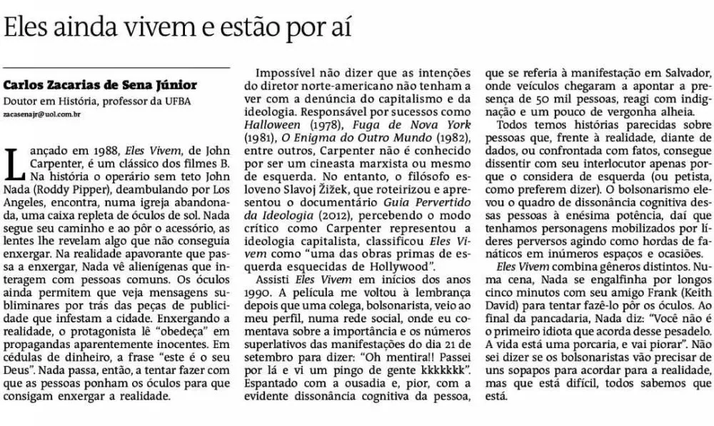 Assisti “Eles vivem” em inícios dos anos 1990. A película me voltou à lembrança depois que uma colega, bolsonarista, veio ao meu perfil, numa rede social, onde eu comentava sobre a importância e os números superlativos das manifestações do dia 21 de setembro para dizer: “Oh mentira!! Passei por lá e vi um pingo de gente kkkkkkk”. Espantado com a ousadia e, pior, com a evidente dissonância cognitiva da pessoa, que se referia à manifestação em Salvador, onde veículos chegaram a apontar a presença de 50 mil pessoas, reagi com indignação e um pouco de vergonha alheia.