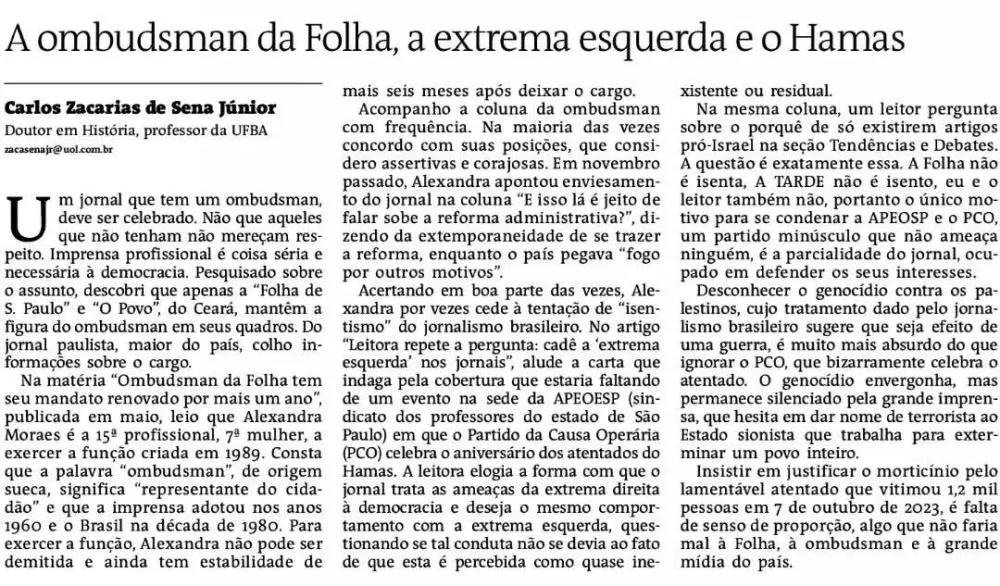 Na mesma coluna, um leitor pergunta sobre o porquê de só existirem artigos pró-Israel na seção Tendências e Debates. A questão é exatamente essa. A Folha não é isenta, A Tarde não é isento, eu e o leitor também não, portanto o único motivo para se condenar a APEOSP e o PCO, um partido minúsculo que não ameaça ninguém, é a parcialidade do jornal, ocupado em defender os seus interesses.