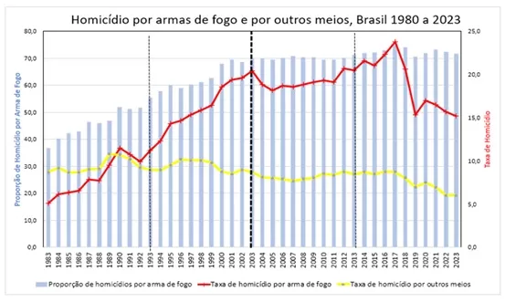 Ilustrando o ponto, o gráfico abaixo apresenta a evolução das taxas de homicídio cometidas com o uso de armas de fogo e por outros meios, além da proporção de homicídios por armas de fogo em relação ao total, entre 1983 a 2023, ou seja: cobrindo o período de duas décadas antes e depois do ED.