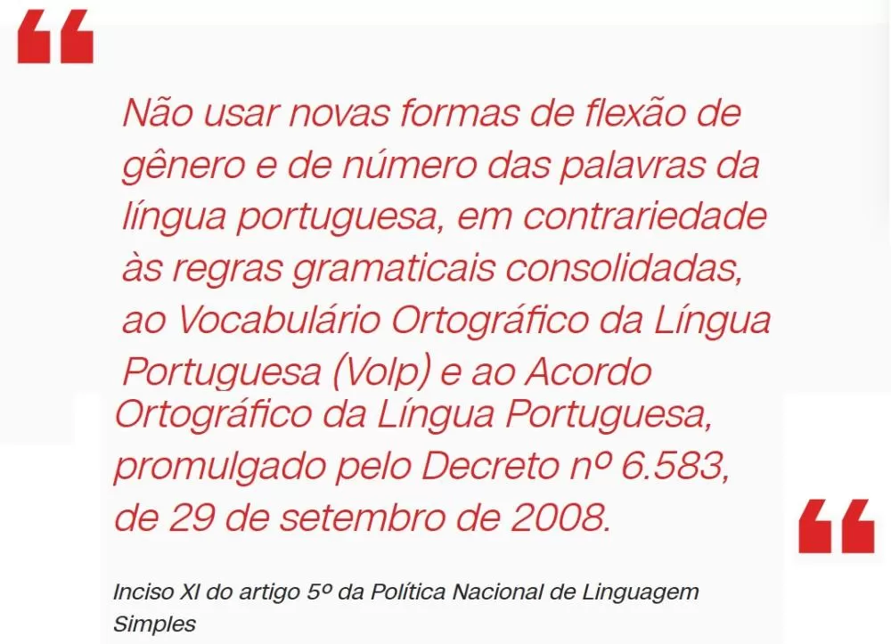 Segundo o artigo 5º da lei, a administração pública não poderá "usar novas formas de flexão de gênero e de número das palavras da língua portuguesa" na redação de textos dirigidos aos cidadãos.