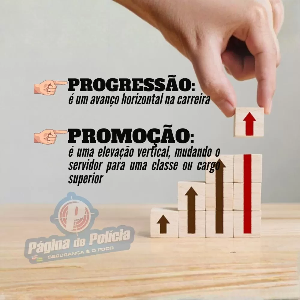 👉🏾 Progressão é um avanço horizontal na carreira, movendo o servidor policial para um nível ou padrão salarial superior dentro da mesma classe ou cargo, baseado em tempo e avaliação de desempenho.