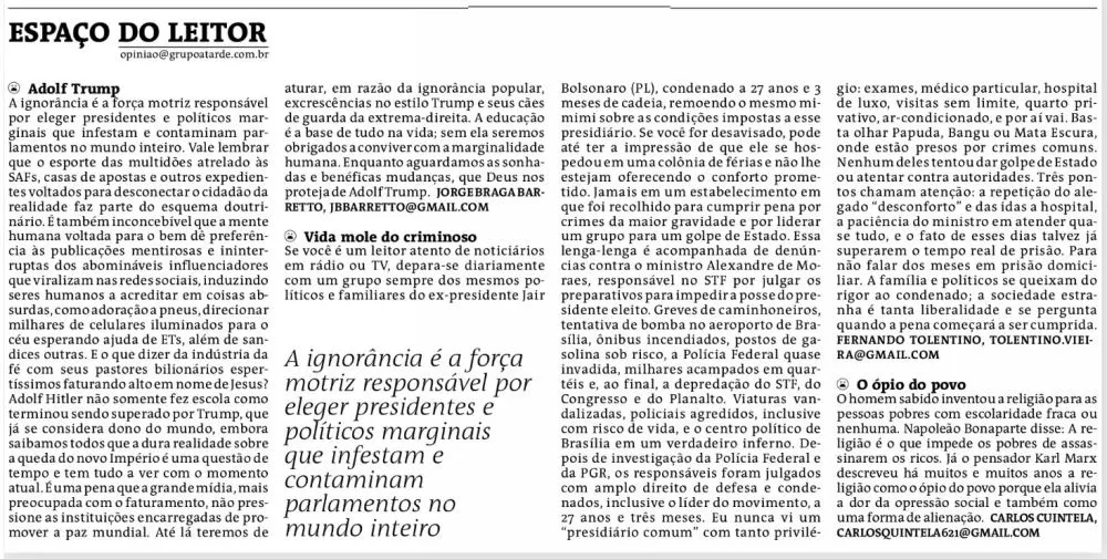 Greves de caminhoneiros, tentativa de explosão de uma bomba no aeroporto de Brasília, uma enorme movimentação que visava impedir a posse do novo presidente, quando alguns ônibus e cerca de dez carros foram incendiados, postos de gasolina sofrendo igualmente esse risco, a sede da Polícia Federal quase sendo invadida. Milhares de pessoas acampadas diante de quarteis. No final, a depredação dos prédios das sedes dos Três Poderes: STF, Congresso Nacional e Palácio do Planalto. Enquanto isso, viaturas da polícia vandalizadas, policiais agredidos, inclusive com o risco de vida, e o centro político de Brasília transformado em um verdadeiro inferno. Algo que fez a baderna contra o Capitólio, nos Estados Unidos, um ano antes quase que parecer uma mera bagunça de adolescentes.