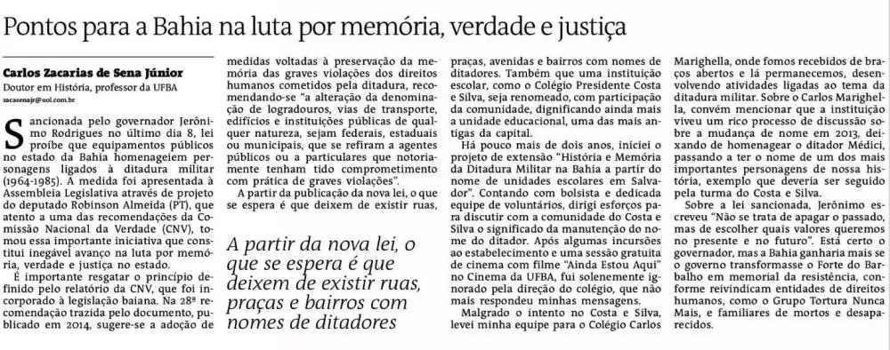 É importante resgatar o princípio definido pelo relatório da CNV, que foi incorporado à legislação baiana. Na 28ª recomendação trazida pelo documento, publicado em 2014, sugere-se a adoção de medidas voltadas à preservação da memória das graves violações dos direitos humanos cometidos pela ditadura, recomendando-se “a alteração da denominação de logradouros, vias de transporte, edifícios e instituições públicas de qualquer natureza, sejam federais, estaduais ou municipais, que se refiram a agentes públicos ou a particulares que notoriamente tenham tido comprometimento com prática de graves violações”.