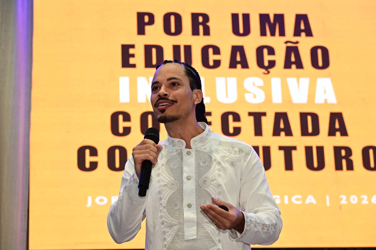 A primeira palestra trouxe o tema da Jornada Pedagógica 2026: “Por uma educação inclusiva: conectada com o futuro”, e foi ministrada pelo professor pós-doutor Diego dos Santos Reis, que é docente da Universidade Federal da Paraíba, no curso de pós-graduação em Educação. “Fui muito bem recebido aqui em Vitória da Conquista, e espero que a palestra desta tarde tenha sido um momento de planejamento e reflexão para todos os que se fizeram presentes”, disse.