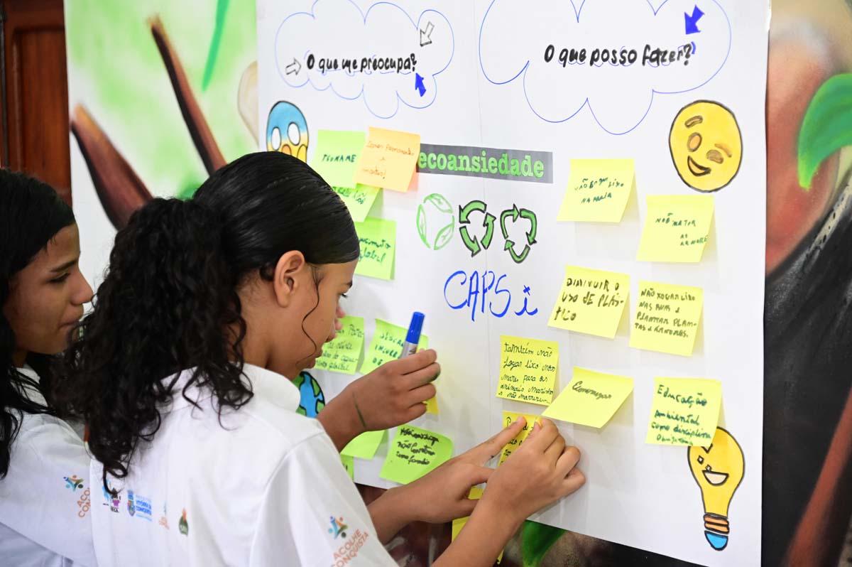 O Núcleo de Cidadania de Adolescentes (Nuca) realizou uma atividade da iniciativa “Entre no Clima Unicef” para debater os impactos das mudanças climáticas na vida emocional de adolescentes. A ação ocorreu na Sala Verde, na Praça da Juventude, como parte da campanha Janeiro Branco, de conscientização sobre o cuidado com a saúde mental, em parceria com a Secretaria Municipal de Meio Ambiente e a Secretaria Municipal de Saúde, por meio do CAPS Infantojuvenil.