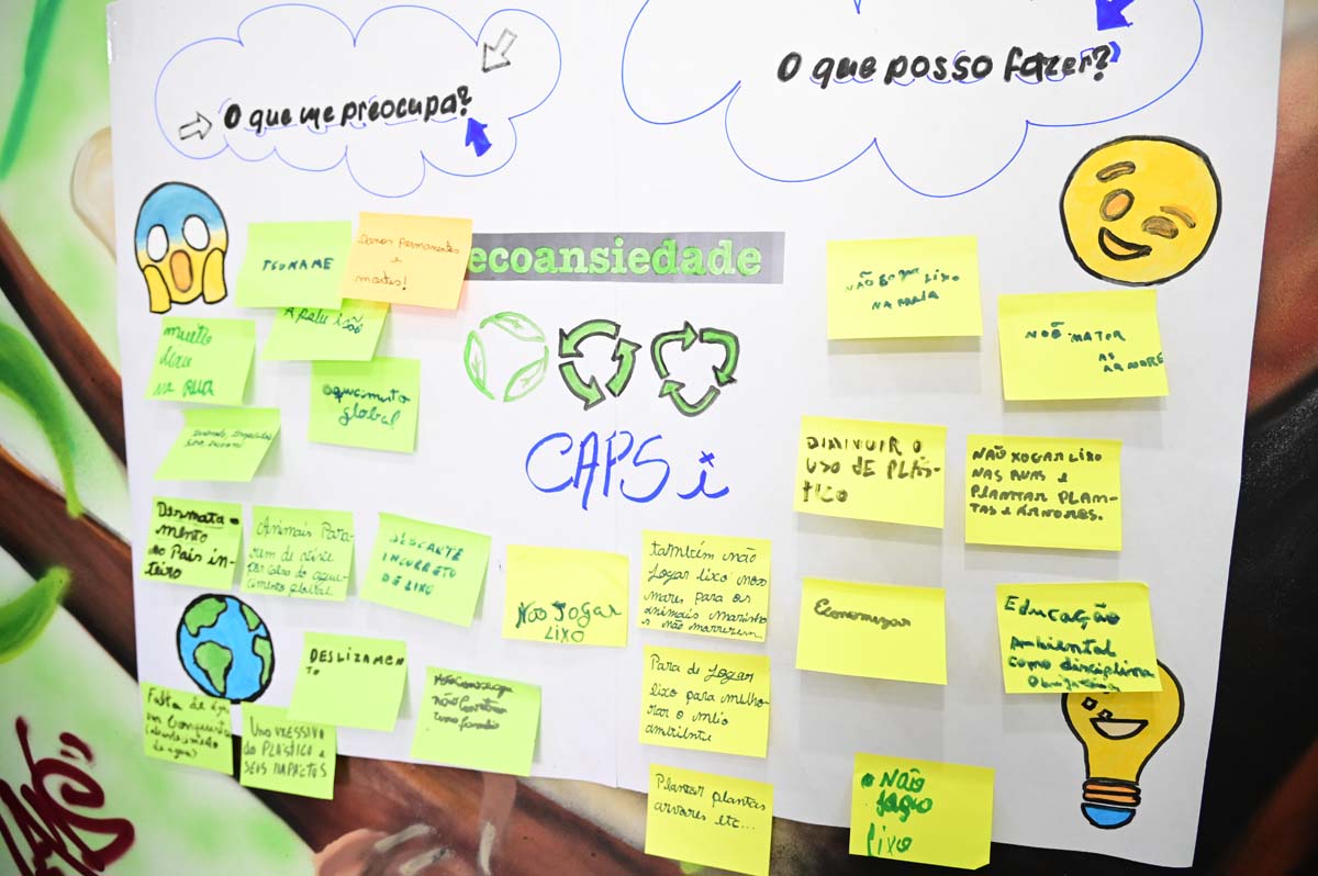 O enfermeiro no CAPS Infantojuvenil, Felipe Alves, realizou uma dinâmica para ajudar os jovens a reconhecerem as emoções ligadas aos impactos das mudanças climáticas e destacou as principais atitudes para enfrentar essa ansiedade. “O reconhecimento que essa ansiedade existe é o primeiro passo para se confortar, e se preocupar em fazer alguma ação para que isso mude. É importante também, cuidar do consumo dessas notícias, a pesquisa em massa de notícias catastróficas pode ser também um grande causador da ecoansiedade”, afirmou.