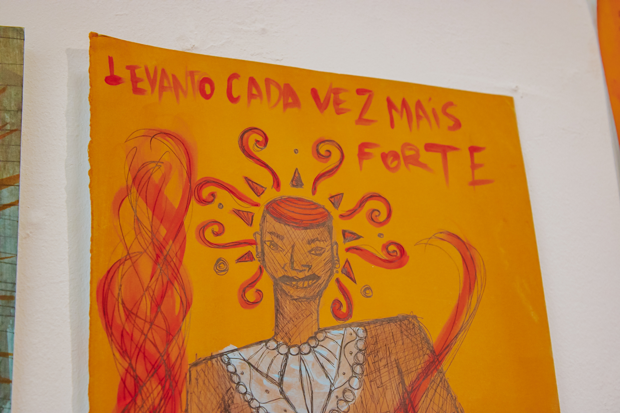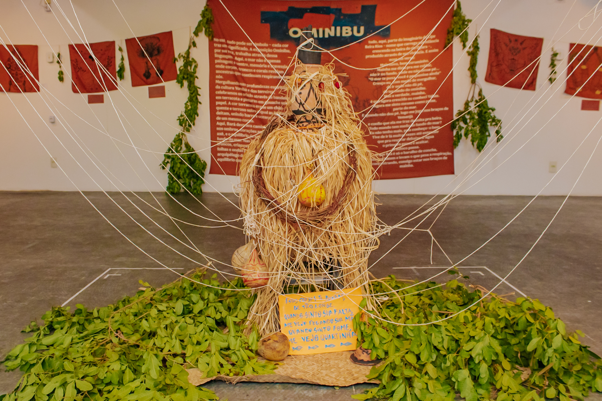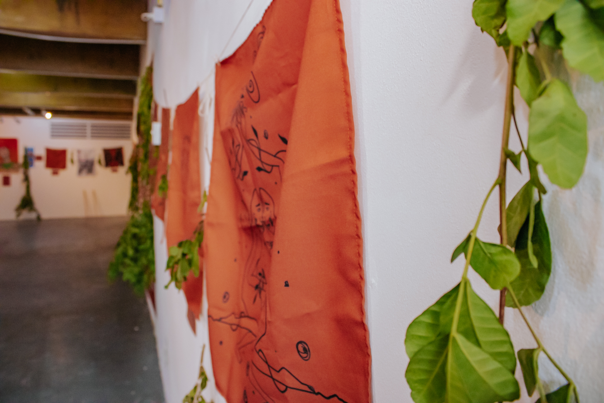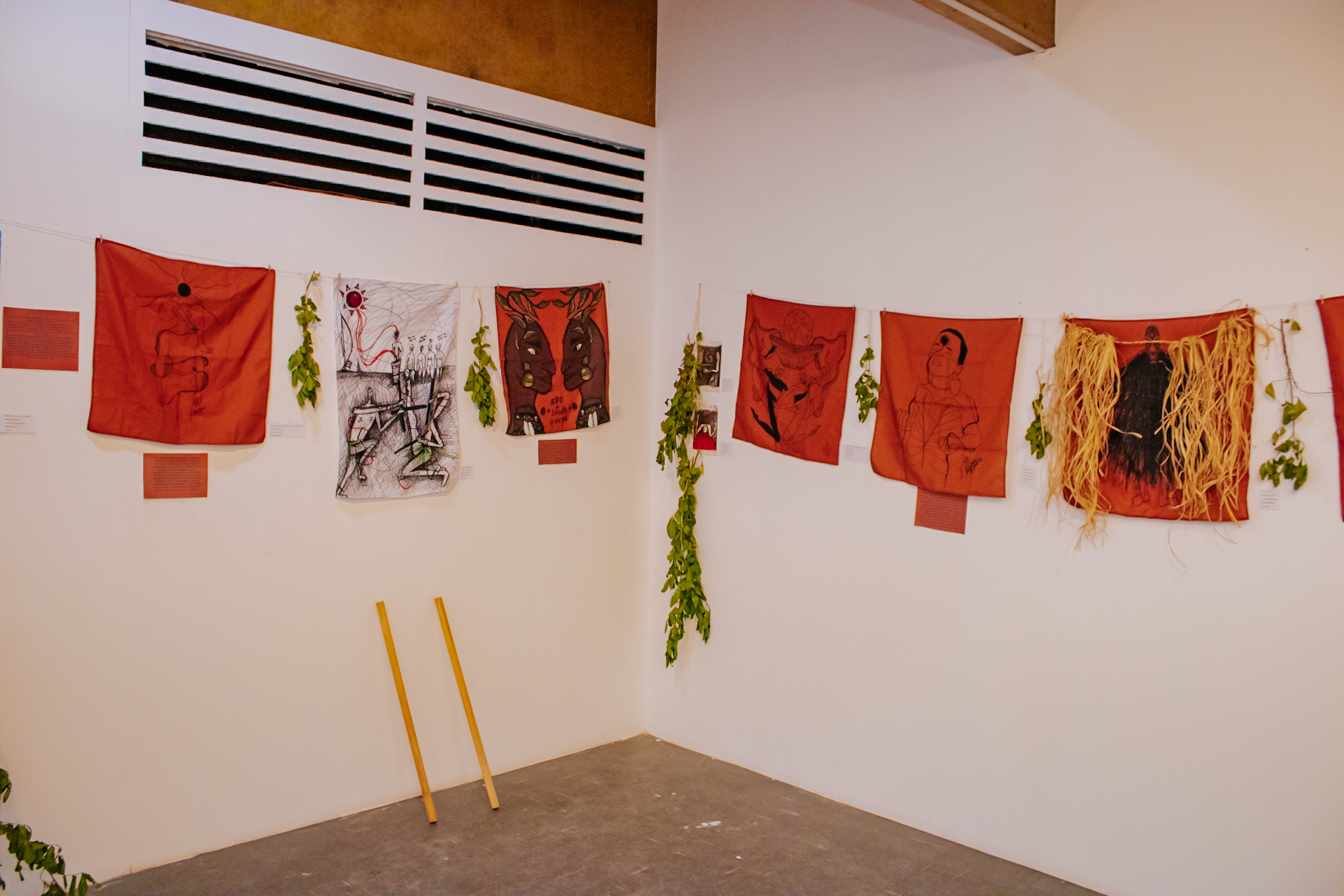 A exposição reúne um conjunto de obras conectadas por um mesmo campo imagético, apresentado em diferentes formatos, escalas e materiais. Pinturas em guache sobre papel dialogam com bandeiras em tecido terracota e desenhos que exploram elementos como peixes, corais, troncos e rostos. Distribuídas pelas paredes e pelo espaço expositivo, as obras criam um percurso em que cor, linha e superfície variam de ritmo, conduzindo o olhar do visitante por diferentes camadas da narrativa visual.