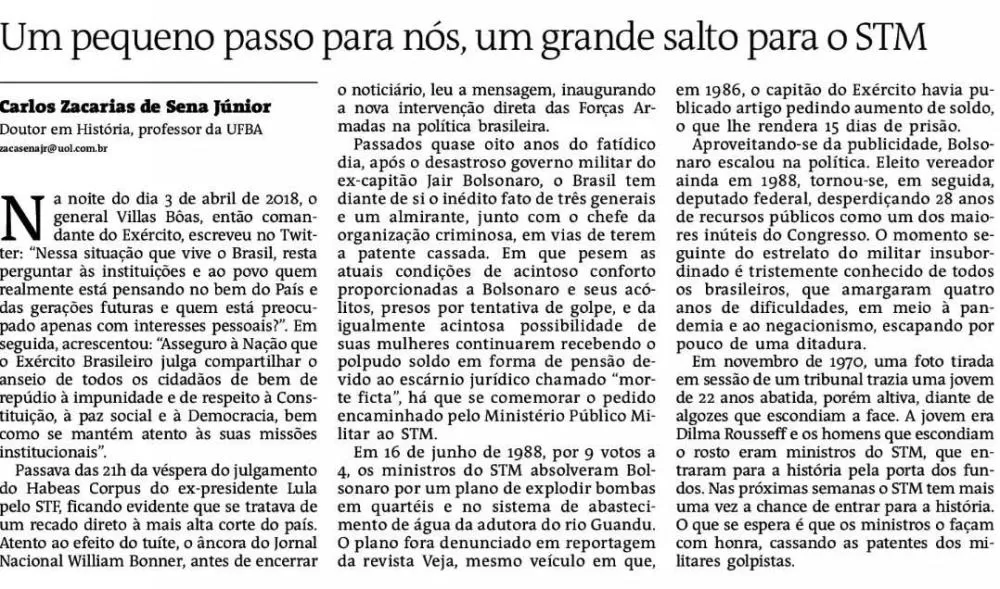 Passados quase oito anos do fatídico dia, após o desastroso governo militar do ex-capitão Jair Bolsonaro, o Brasil tem diante de si o inédito fato de três generais e um almirante, junto com o chefe da organização criminosa, em vias de terem a patente cassada. Em que pesem as atuais condições de acintoso conforto proporcionadas à Bolsonaro e seus acólitos, presos por tentativa de golpe, e da igualmente acintosa possibilidade de suas mulheres continuarem recebendo o polpudo soldo em forma de pensão devido ao escárnio jurídico chamado “morte ficta”, há que se comemorar o pedido encaminhado pelo Ministério Público Militar ao STM.