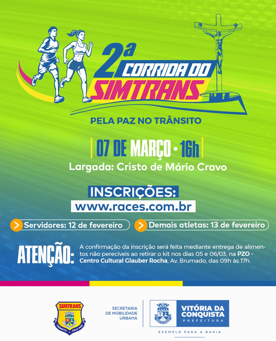 As inscrições de 100 servidores municipais para a 2ª Corrida do Simtrans, que acontece no dia 7 de março, estarão abertas nesta quinta-feira (12). E a partir das 10h de sexta-feira (13), as inscrições serão abertas para o publico geral, contemplando pessoas a partir de 15 anos de idade.