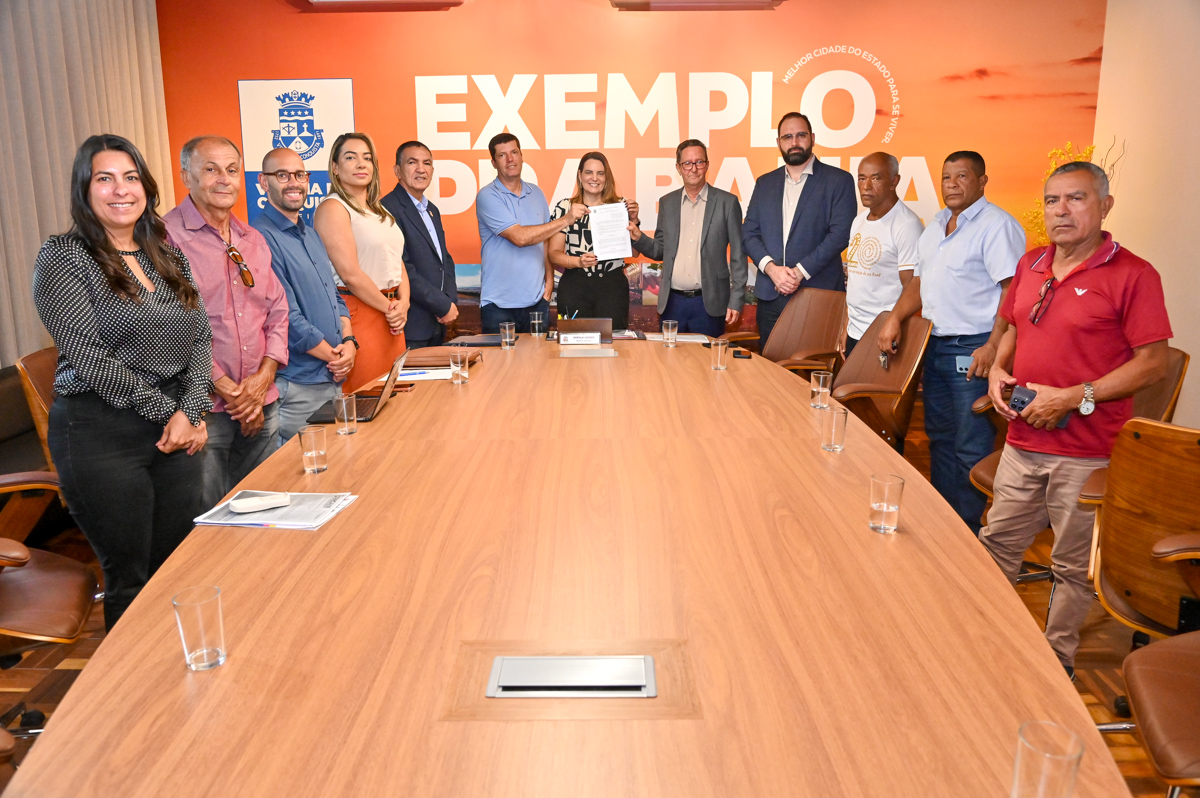 Na manhã desta terça-feira (10), representantes do Sindicato dos Condutores Autônomos de Veículos Rodoviários (Sincavir) compareceram ao Salão Nobre do Palácio da Joia do Sertão Baiano para apresentar e debater demandas da categoria com o Governo Municipal. Durante o encontro, a prefeita Sheila Lemos assinou o decreto nº 24.097/2026, que regulamenta a prestação do serviço de Transporte Individual de Passageiros por Veículo da Categoria Táxi no Município.