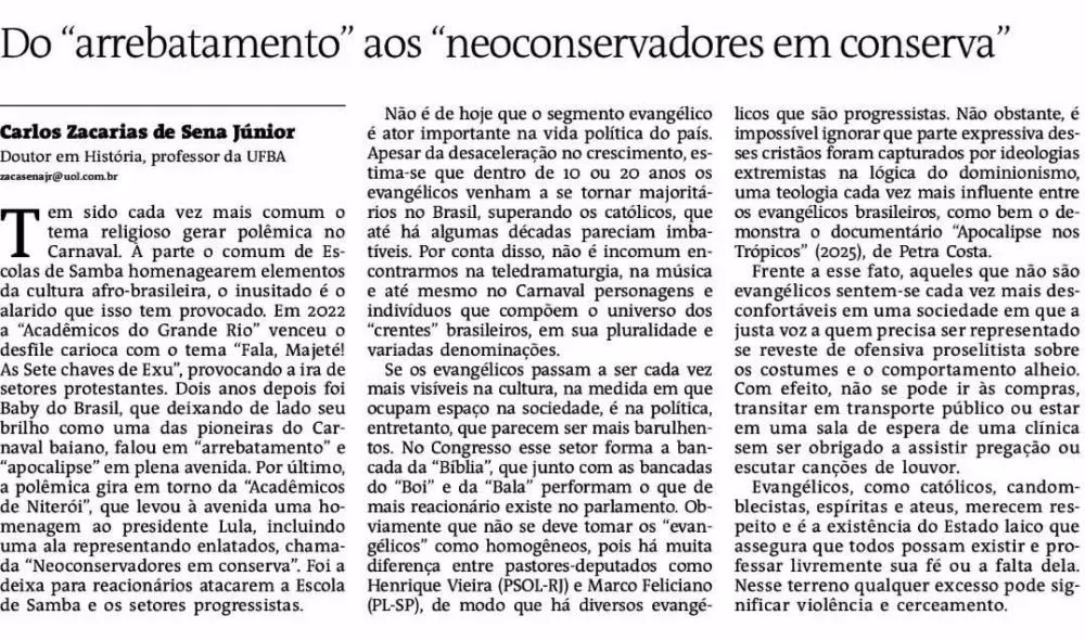 Tem sido cada vez mais comum o tema religioso gerar polêmica no Carnaval. À parte o comum de Escolas de Samba homenagearem elementos da cultura afro-brasileira, o inusitado é o alarido que isso tem provocado. Em 2022 a “Acadêmicos do Grande Rio” venceu o desfile carioca com o tema “Fala, Majeté! As Sete chaves de Exu”, provocando a ira de setores protestantes. Dois anos depois foi Baby do Brasil, que deixando de lado seu brilho como uma das pioneiras do Carnaval baiano, falou em “arrebatamento” e “apocalipse” em plena avenida. Por último, a polêmica gira em torno da “Acadêmicos de Niterói”, que levou à avenida uma homenagem ao presidente Lula, incluindo uma ala representando enlatados, chamada “Neoconservadores em conserva”. Foi a deixa para reacionários atacarem a Escola de Samba e os setores progressistas.
