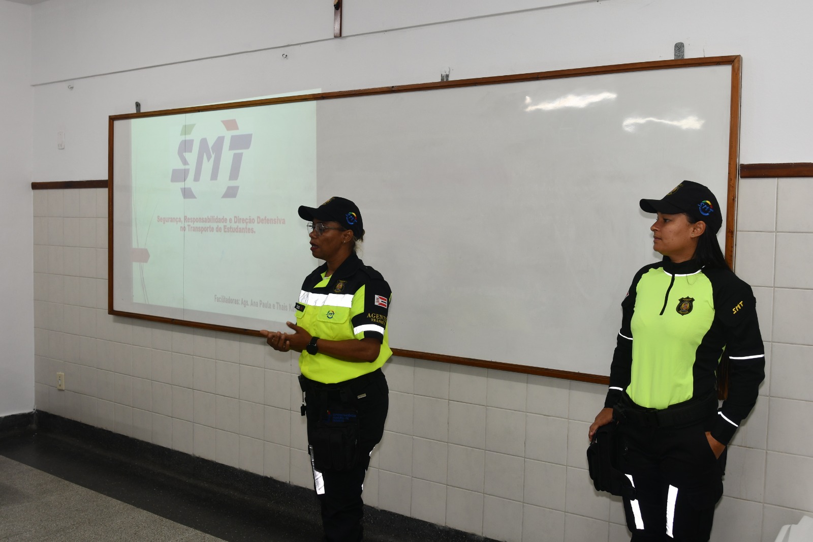 A equipe da Superintendência Municipal de Trânsito deu orientações práticas sobre segurança no embarque e desembarque, organização no interior dos veículos e procedimentos em situações de emergência.