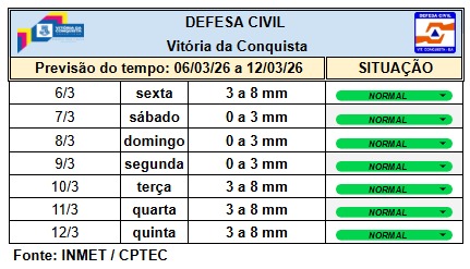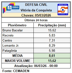 De acordo com o Inmet, Vitória da Conquista está sem alerta de chuvas para esta sexta-feira (6). Segundo a Coordenação de Proteção e Defesa Civil (Compdec), a previsão para a próxima semana é de estabilidade, com pouco volume de chuvas. Nas últimas 24 horas, foi registrada uma média de 8,61 mm de chuva, com o pluviômetro do Bruno Bacelar tendo a maior média: 15, 62mm.