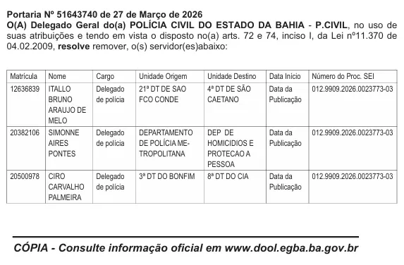 A Portaria nº 51643740, publicada em 27 de março de 2026 no Diário Oficial do Estado (DOE), oficializou a remoção de delegados da Polícia Civil da Bahia, entre eles o delegado Ítallo Bruno Araújo de Melo.