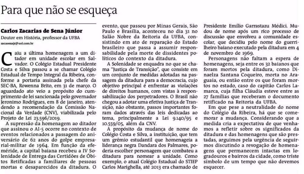 Caiu a última homenagem a um ditador em unidade escolar em Salvador. O Colégio Estadual Presidente Costa e Silva passou a se chamar Colégio Estadual de Tempo Integral da Ribeira, conforme a portaria assinada pela chefe da SEC-BA, Rowenna Brito, em 31 de março. O aguardado ato veio a propósito do cumprimento de lei sancionada pelo governador Jeronimo Rodrigues, em 8 de janeiro, atendendo a recomendação da Comissão Nacional da Verdade (CNV), viabilizada pelo Projeto de Lei 23.596/2019.