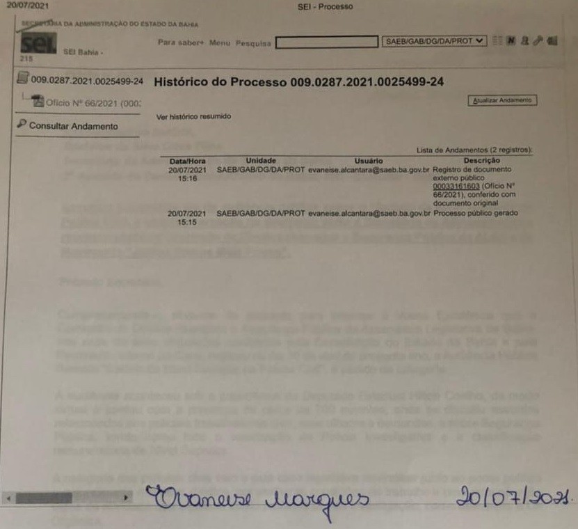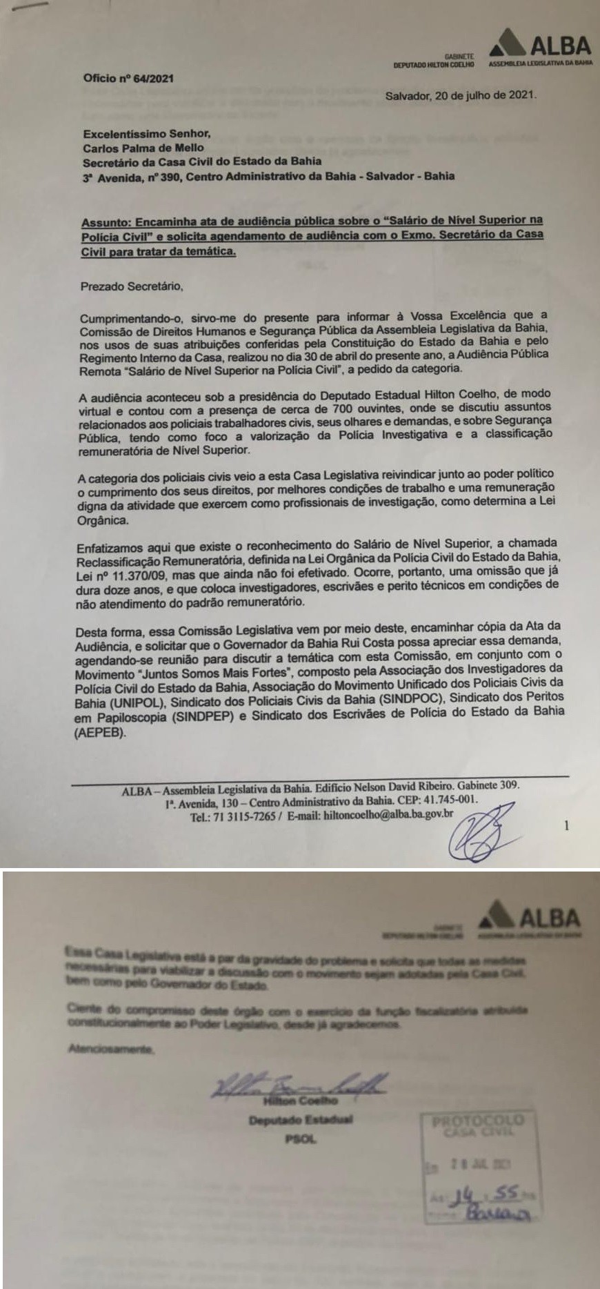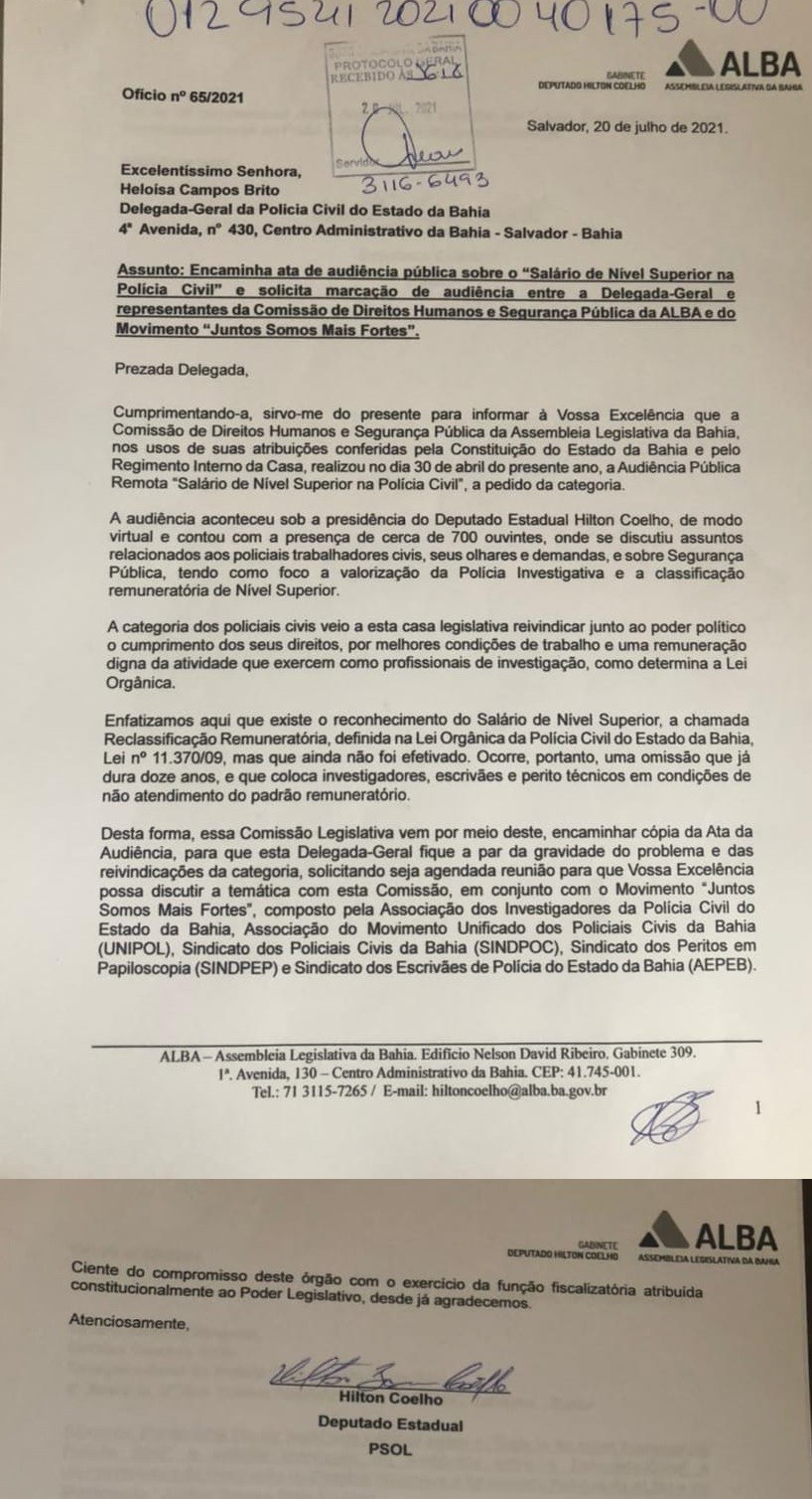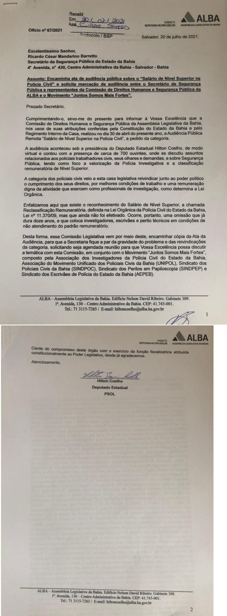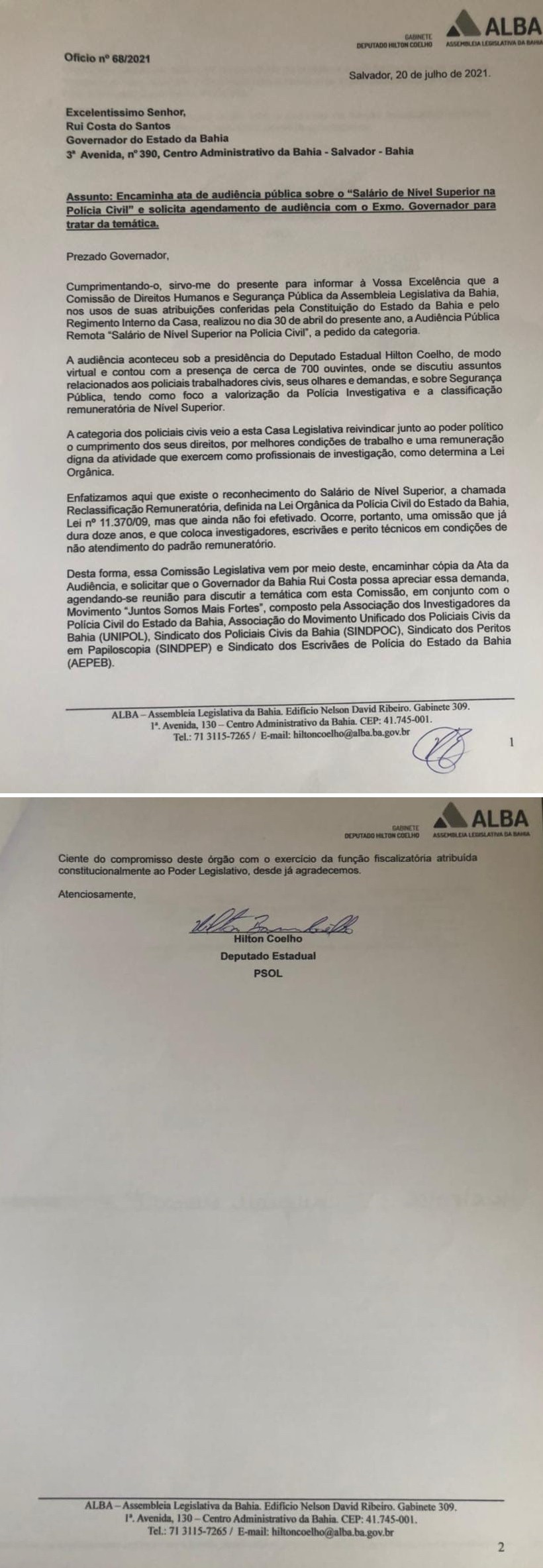 Após realização de AUDIÊNCIA PÚBLICA ocorrida em 30/04/2021, promovida pela COMISSÃO DE DIREITOS HUMANOS E SEGURANÇA PÚBLICA/Assembleia Legislativa da Bahia - ALBA e presidida pelo Deputado Estadual Hilton Coelho – PSOL/BA. Foi registrado um recorde de público participante nunca visto em uma audiência pública naquela casa, revelando a desvalorização e o descaso que o Governo da Bahia tem com os profissionais da segurança pública, em especial com Investigadores, Escrivães e Peritos Técnicos.