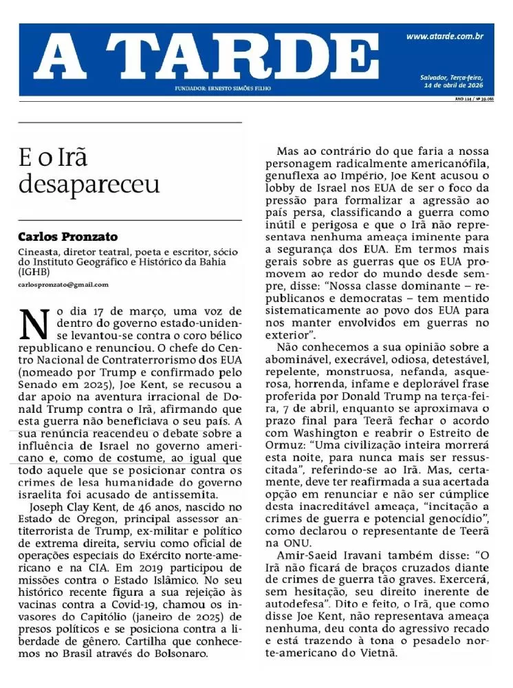 O meu artigo quinzenal no jornal A TARDE, da Bahia. 14.04.2026
