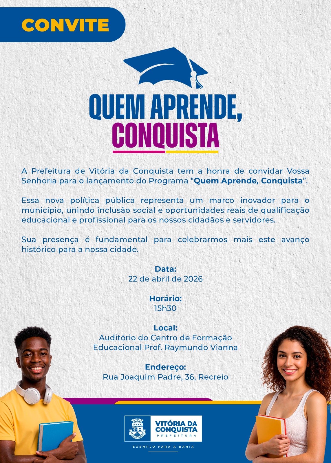 Com o objetivo de democratizar o acesso ao ensino superior, a Prefeitura de Vitória da Conquista lança, nesta quarta-feira (22), às 15h30, no Auditório do Centro de Formação Educacional Prof. Raymundo Vianna, o programa “Quem Aprende, Conquista”.