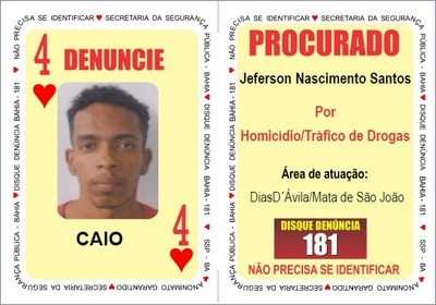 Jeferson Nascimento Santos, o “Caio”, também foragido desde o ano passado, obteve o benefício de saída temporária, mas não se apresentou no período determinado. Procurado por homicídio e tráfico de drogas, Caio passa a ilustrar o naipe ‘Quatro de Copas’ e é atuante nos municípios de Dias D´ávila e Mata de São João.