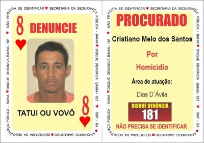Cristiano Melo dos Santos, conhecido como “Tatui” ou “Vovô”, atua no município de Dias D´Ávila, distante 51 quilômetros de Salvador. Indiciado por homicídio, ele é o novo representante da carta ‘Oito de Copas’.
