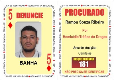 Já procurado pelos crimes de tráfico de drogas e homicídio, Ramon Souza Ribeiro, o “Banha”, que atua na região de Candeias, passa a ocupar a carta ‘Cinco de Ouros’. Banha é foragido do sistema prisional baiano desde março de 2019.