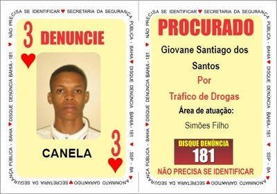 Conhecido como “Canela”, Giovane Santiago dos Santos foi adicionado na carta ‘Três de Copas’. Ele é investigado por tráfico de drogas e sua área de atuação é na região de Simões Filho.