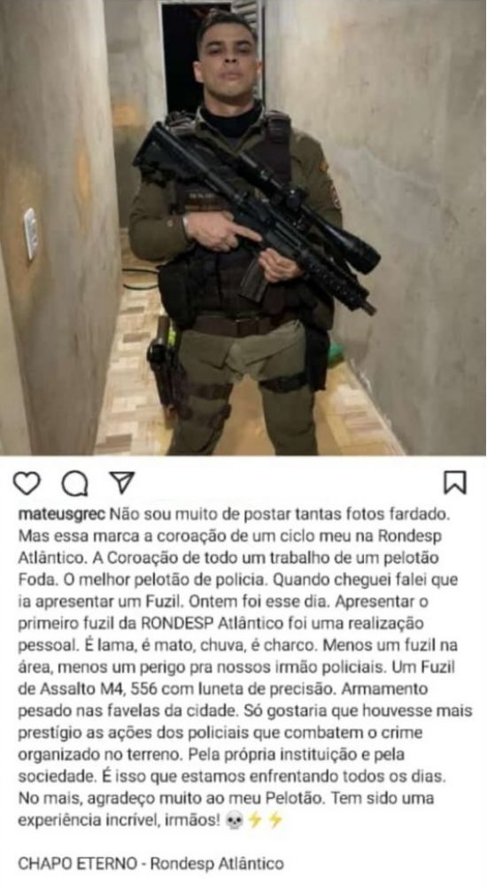 A última postagem do tenente no Instagram fala da dificuldade do trabalho da polícia, da falta de prestígio e do amor pela Rondesp Atlântico.