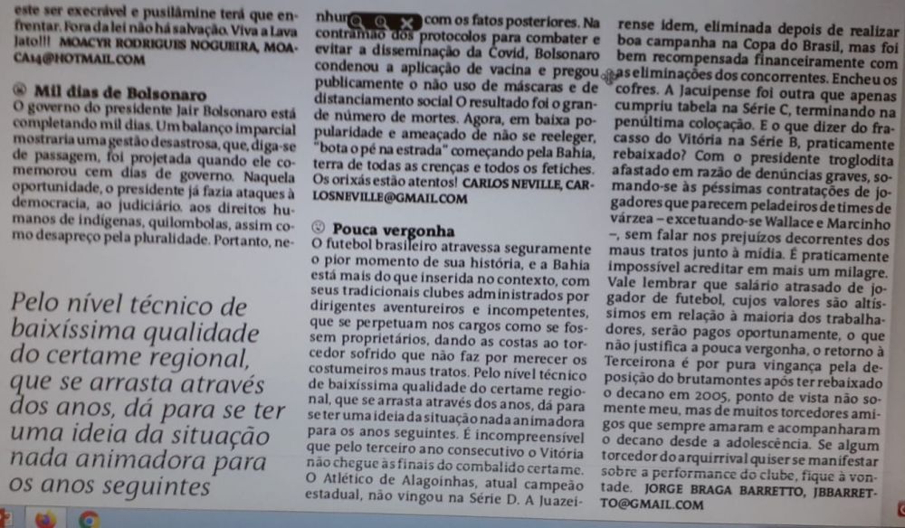 (*) Publicado no Jornal A Tarde, (Espaço do Leitor), edição de 29.09.2021.
