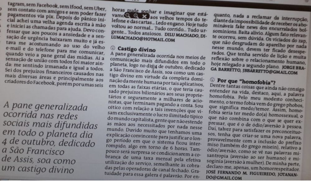 A pane generalizada ocorrida nos meios de comunicação mais difundidos em todo o planeta, logo no dia 04 de outubro, dedicado a São Francisco de Assis, soa como um castigo divino em virtude da completa dominação da mente humana por tais aplicativos, em todas as faixas etárias, o que teria causado prejuízos bilionários aos seus proprietários e seguramente a milhares de acionistas, que terminam pagando a conta.