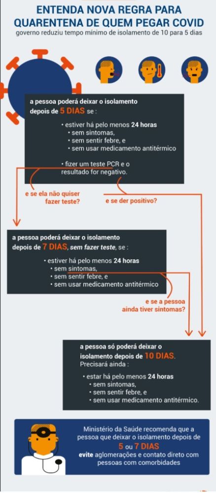 Existe ainda uma possibilidade de encurtar ainda mais o tempo de isolamento. Caso no quinto dia o paciente não tenha mais nenhum sintoma respiratório, não apresente febre e esteja há 24 horas sem usar medicamento antitérmico, ele pode fazer um teste rápido de covid-19. Se o teste der negativo para o vírus, ele também está liberado.