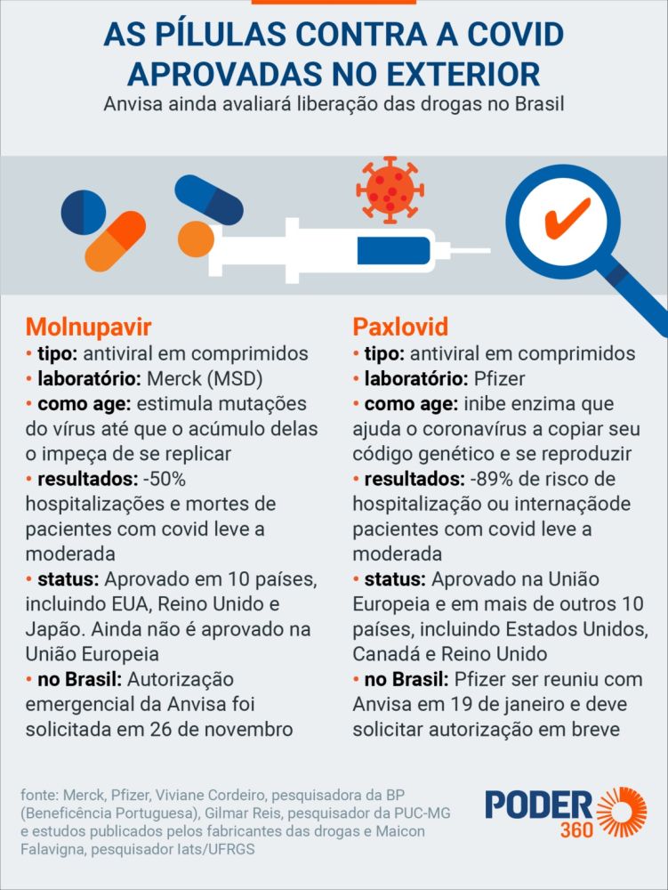 O laboratório Merck pediu autorização à Anvisa para o uso no Brasil do molnupiravir em 26 de novembro de 2021. A Pfizer fez uma reunião com a agência em 19 de janeiro para pré-submissão do pedido de uso emergencial do paxlovid. Deve fazer a solicitação em breve.