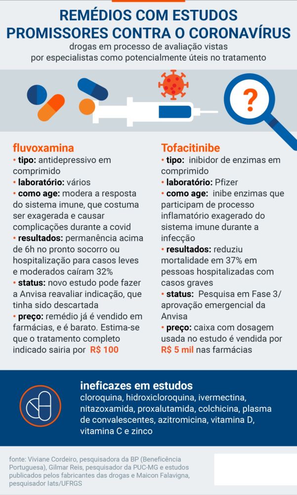 Dois remédios que são acompanhados por pesquisadores e podem vir a ser liberados são a fluvoxamina e o tofacitinibe.
