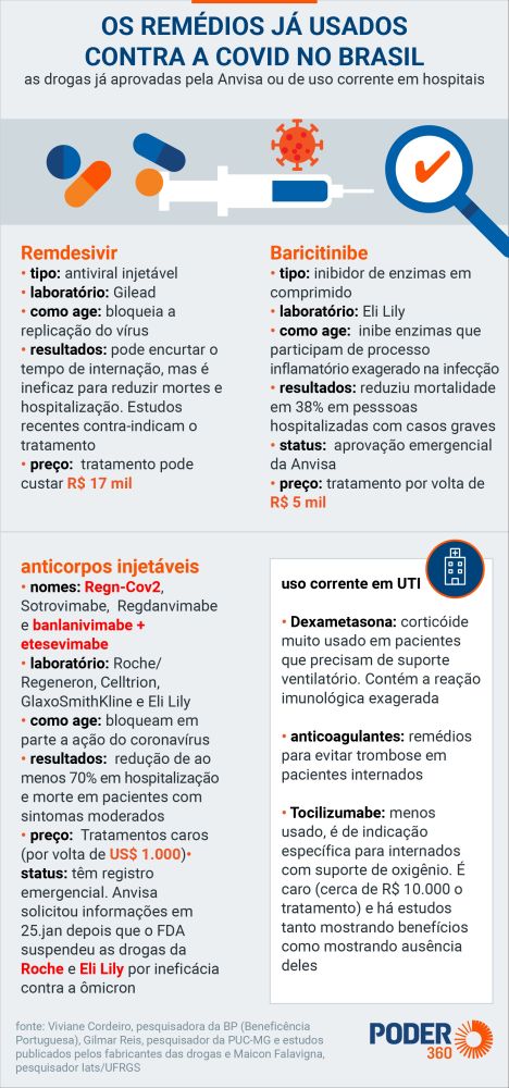 O Poder360 compilou abaixo os principais remédios já usados no Brasil e no mundo e os que ainda estão sendo estudados em tratamentos contra a covid.