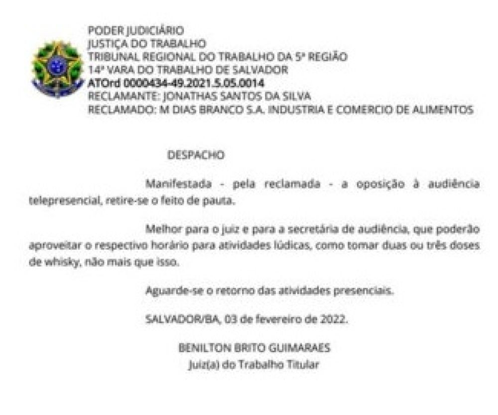 A não realização de uma audiência trabalhista designada para a tarde desta sexta-feira (4/2), porque a parte reclamada se opôs a participar do ato por meio de videoconferência, virou motivo de comemoração para o juiz. Titular da 14ª Vara do Trabalho de Salvador, Benilton Brito Guimarães retirou o processo da pauta e disse, em despacho, que agora poderá aproveitar melhor o tempo para se dedicar a “atividades lúdicas” e ingerir uísque.