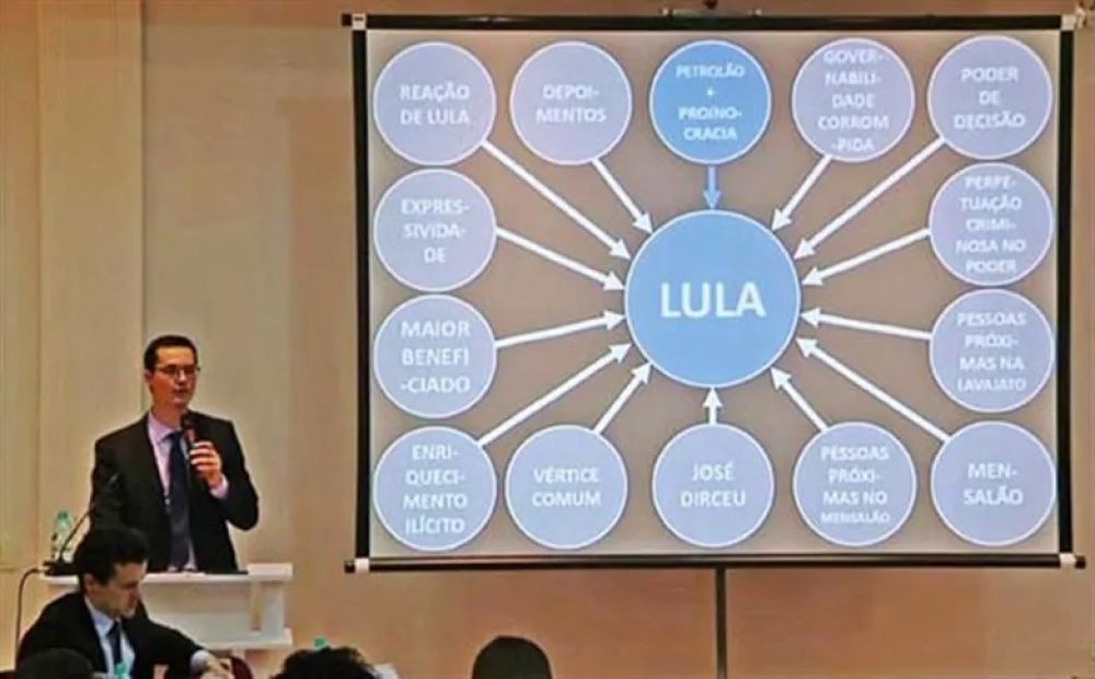 Deltan Dallagnol participou da entrevista, em setembro de 2016, para o esclarecimento da denúncia relativa ao caso do triplex do Guarujá. Na coletiva, o ex-procurador utilizou uma imagem criada no PowerPoint para apontar Lula como “maestro” e “comandante” do esquema investigado na Lava Jato.