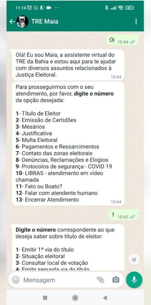 Através da parceria, os eleitores poderão utilizar os serviços do Núcleo de Atendimento Virtual ao Eleitor (NAVE), pelo aplicativo Whatsapp. Para isso, basta salvar na agenda o telefone (71) 3373-7000 ou clique aqui para ser redirecionado. O mesmo número já é utilizado pelo TRE para agendamento de atendimento presencial para eleitores, e ainda resolver demandas por telefone. As ferramentas da inteligência artificial Maia já estão disponíveis para os eleitores no site do TRE e também no aplicativo Telegram.