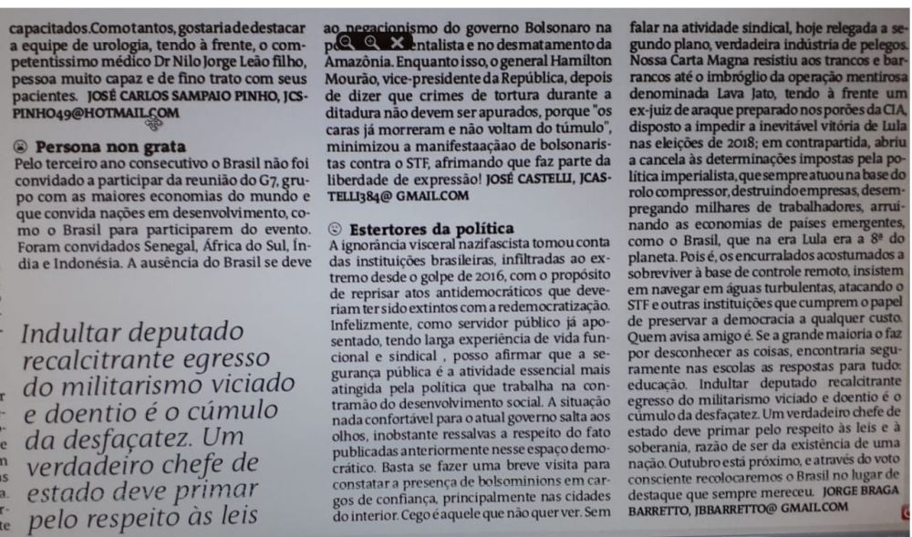Pois é, os encurralados acostumados a sobreviver à base de controle remoto, insistem em navegar em águas turbulentas, atacando o STF e outras instituições que cumprem o papel de preservar a democracia a qualquer custo. Quem avisa amigo é. Se a grande maioria o faz por desconhecer as coisas, encontraria seguramente nas escolas as respostas para tudo: educação. Indultar deputado recalcitrante egresso do militarismo viciado e doentio é o cúmulo da desfaçatez. Um verdadeiro chefe de estado deve primar pelo respeito às leis e à soberania, razão de ser da existência de uma nação. Outubro está próximo, e através do voto consciente recolocaremos o Brasil no lugar de destaque que sempre mereceu.