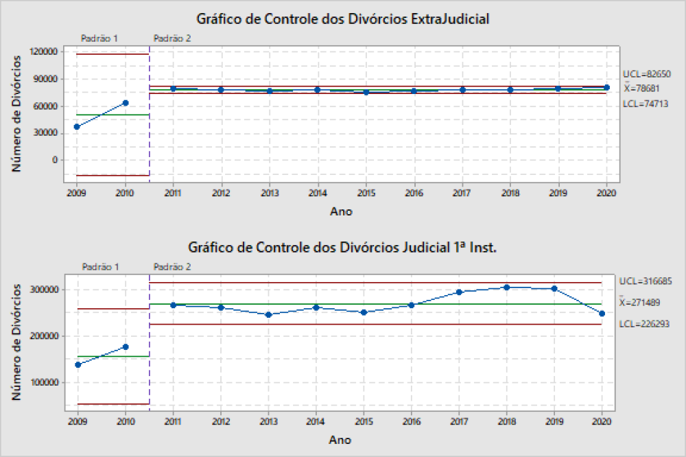 No entanto, para verificar o crescimento ou a estabilidade, lançamos mão do gráfico de controle, no qual os limites estatísticos nos permitem afirmar de maneira mais segura as tendências observadas. É possível analisar que os divórcios extrajudiciais representaram 25% do total em 2020. Já os judiciais de primeira instância, 75%.
