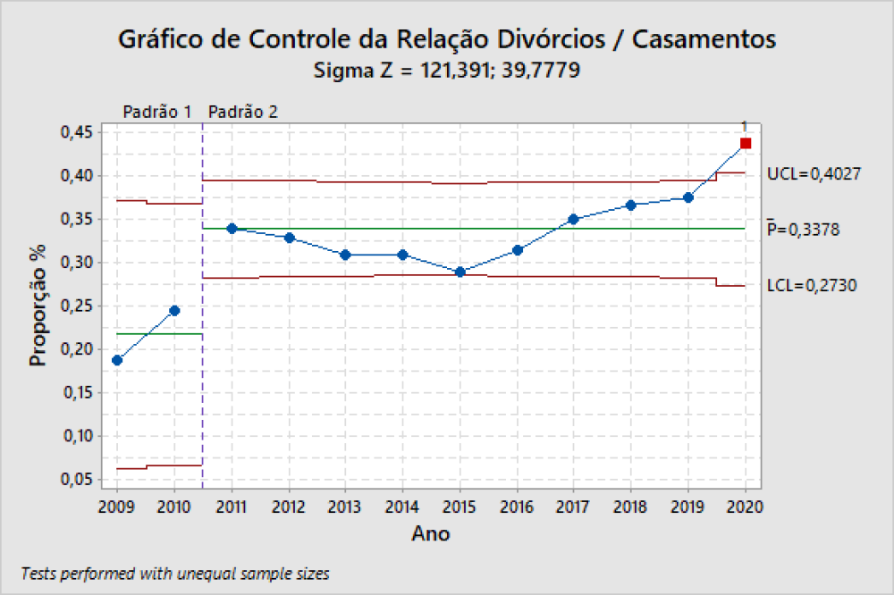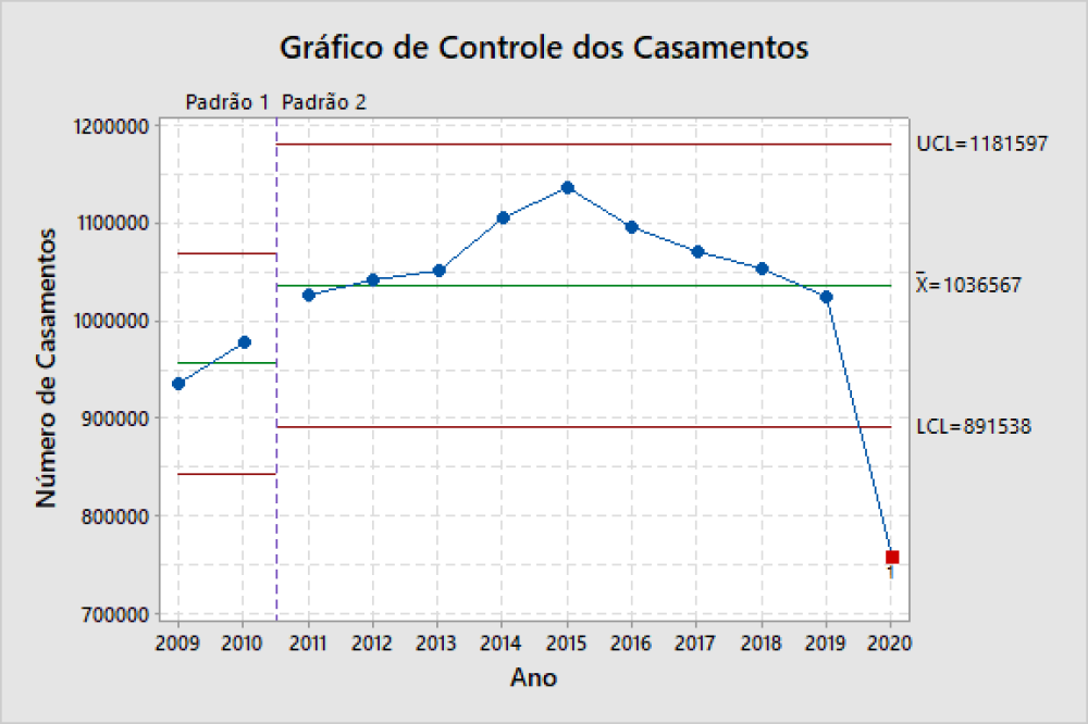 Segundo os dados do IBGE, não. Pelo IBGE, o número de divórcios extrajudiciais em 2020 foi de 81.311, não 77.509 como afirmado pelo Colégio Notarial do Brasil. E, ao avaliar o gráfico de controle dos divórcios extrajudiciais, qualquer resultado entre 74.713 e 82.650, pode ser considerado variação normal do processo, ou seja, nada digno de nota.