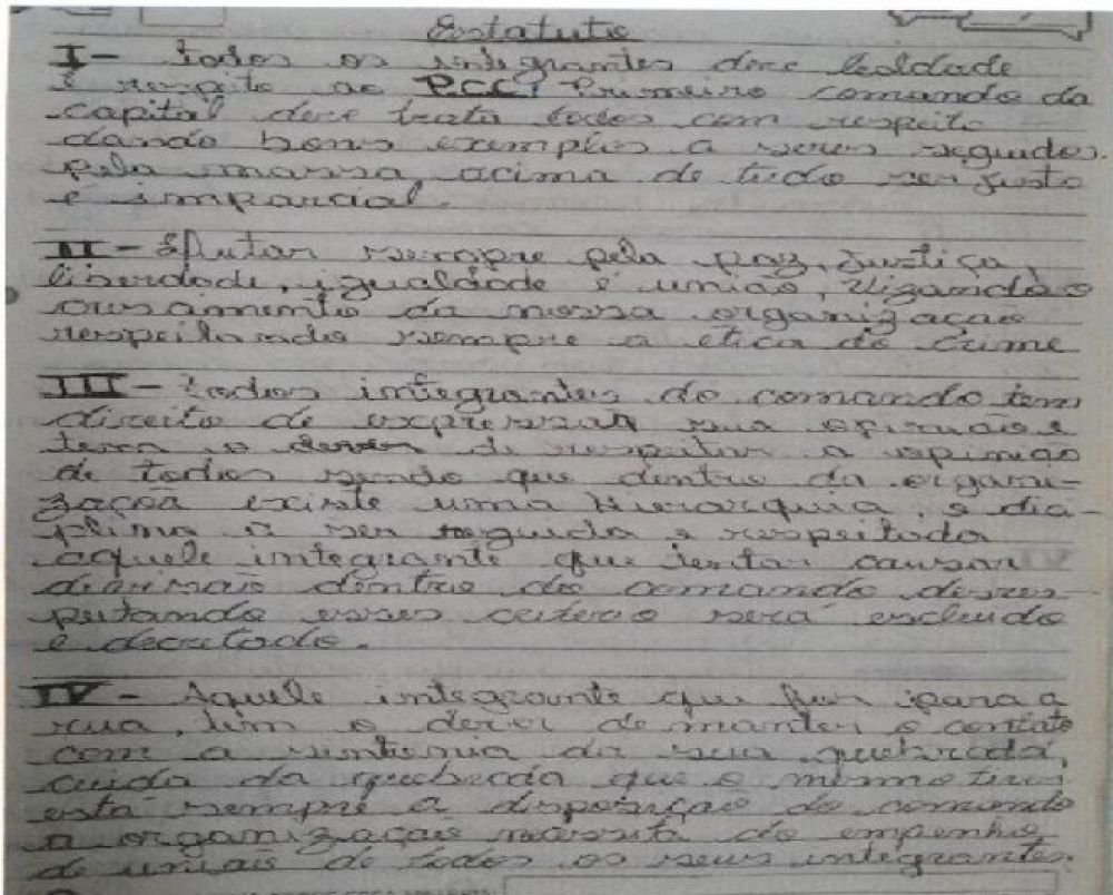 Suposto estatuto do Primeiro Comando da Capital divulgado em jornais e noticiários brasileiros no ano de 2001.