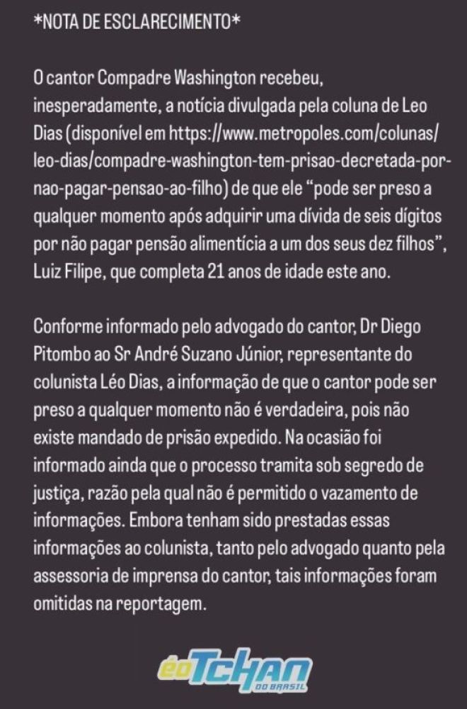 Em Nota o cantor do “É O TCHAN” Compadre Washington, esclarece, confira