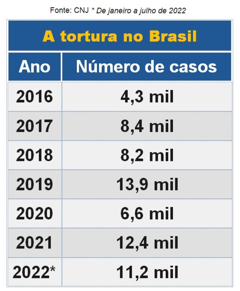 De 2019 até julho de 2022, portanto na gestão de Jair Bolsonaro, os relatos de tortura de presos feitos a juízes mais do que dobraram, de acordo com dados do Conselho Nacional de Justiça (CNJ). São pelo menos 44,2 mil denúncias sobre tortura e maus tratos feitas a magistrados durante audiências de custódia, incluindo os meses da epidemia da Covid-19.