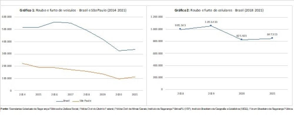 Os dados acima demonstram que, muito embora tenhamos verificado queda nos crimes patrimoniais no período entre 2019 e 2020, com o início da pandemia de Covid-19, essa tendência não se manteve no período mais recente. O ano de 2021 foi marcado pela retomada das atividades, principalmente a partir do avanço da vacinação, e o que as estatísticas nos indicam é que também houve retomada de parte considerável das ocorrências de crimes contra o patrimônio – como falado anteriormente, tivemos leve crescimento de roubo a estabelecimentos comerciais, a residências, roubo a instituições financeiras (com destaque para os casos de maior repercussão, como no “novo cangaço”) e roubo de carga. As taxas, contudo, ainda não se igualam aos patamares anteriores à pandemia de Covid-19. Os crescimentos mais significativos ocorreram no crime de estelionato, com taxas muito acima daquelas vistas em 2018 e 2019, e de estelionato no contexto virtual. Entre 2020 e 2021, houve, praticamente, estabilidade no roubo e furto de veículos e roubo e furto de celulares. Tivemos, ademais, queda de roubo a transeunte e queda no total de roubos.