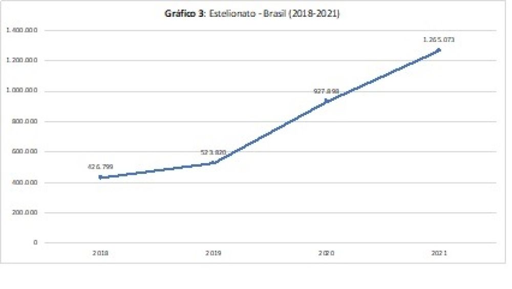 Entre 2018 e 2021, foram registrados 3,1 milhões de casos de estelionato. Em 2021, o número chegou a 1,2 milhão de registros, o que corresponde a um significativo aumento de 179,9% nas taxas, por 100 mil habitantes, em relação a 2018 (entre 2020 e 2021, o aumento foi de 36,3%). Vale ressaltar que não houve queda em nenhuma das UF no período.