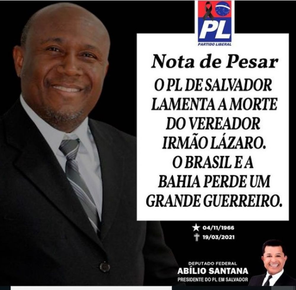 O deputado federal e presidente do PL em Salvador, Abílio Santana lamentou a morte do vereador Irmão Lázaro, vítima da covid, na sexta-feira (19). Abílio afirmou que Lázaro era um “homem de fé e certamente está nos braços do Deus pai “.
