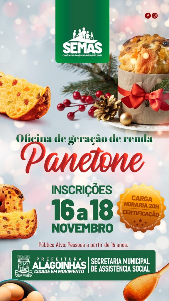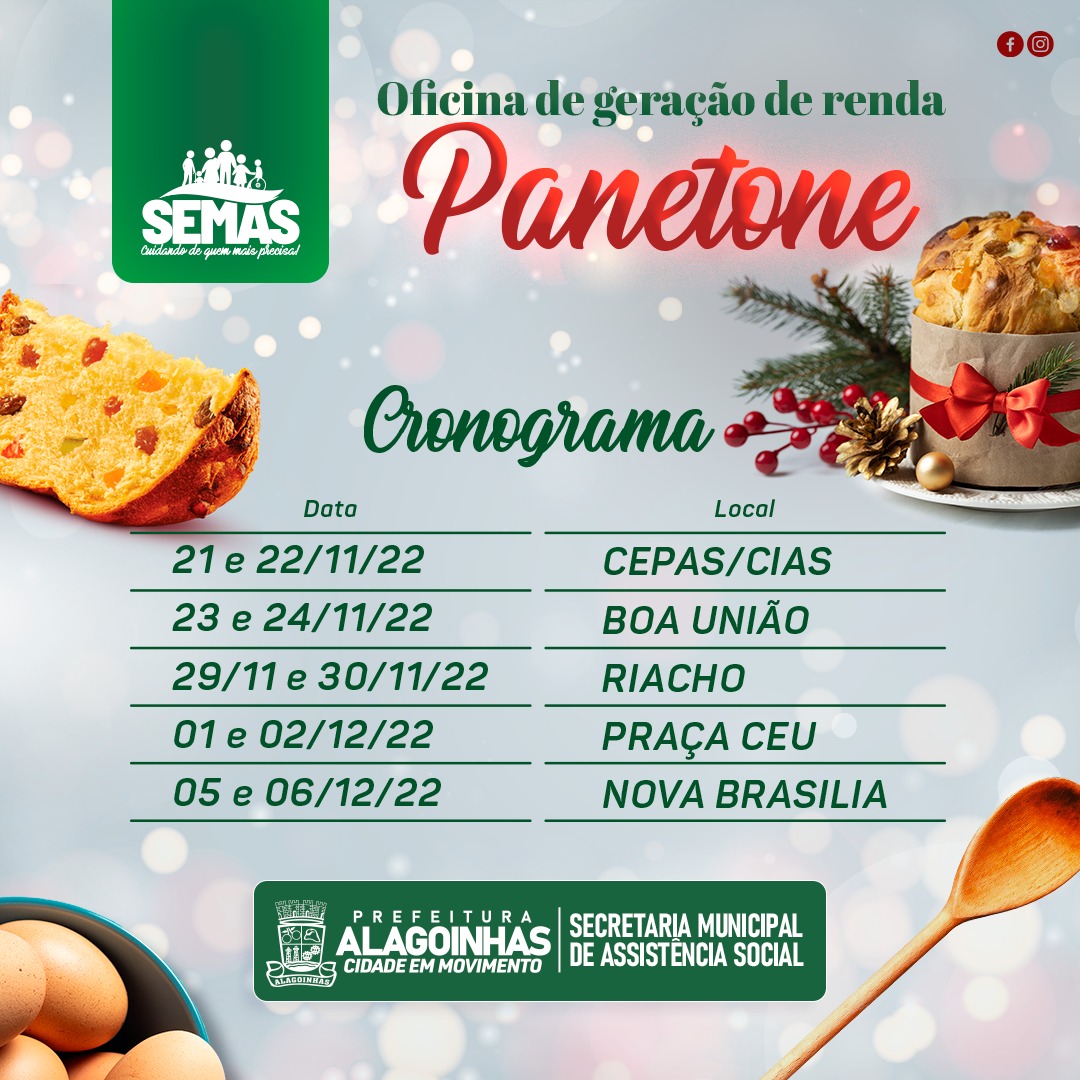 Dessa vez, os participantes irão aprender a produzir Panetone, pão doce e aromático, cujas vendas disparam no período natalino. “Nossa intenção é proporcionar ao público, a oportunidade de não só aprender a fazer esse pão italiano que é um velho conhecido dos brasileiros, mas também incentivar a sua venda, a fim de aumentar a renda das famílias nesse final de ano”, declarou o secretário de Assistência Social Rui Costa Brito.
